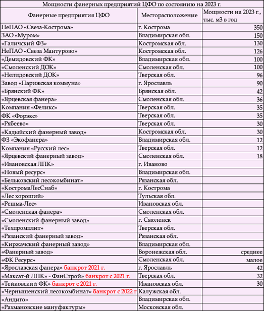 ИНФО: ТАБЛИЦЫ - Мощности фанерных заводов ЦФО