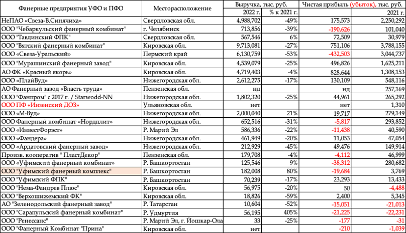 Таблица. Ключевые финансовые итоги предприятий УФО по выпуску фанеры и шпона, а также древесных плит в 2022 г.