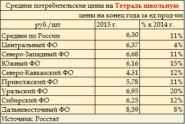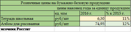 Для изучения спроса на бумажно-беловые товары рассмотрим две основные позиции, а именно тетради школьные и альбомы для рисования. Цены на данные товары указаны по состоянию на декабрь 2016 года в сравнении с уровнем цен на конец предыдущего года. Приводятся средние цены розничной торговли в целом по России. В цены включен налог на добавленную стоимость (НДС).