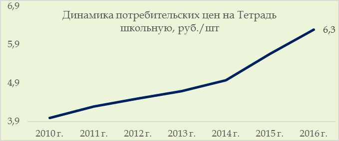 Отмечая динамику потребительских цен на ученические тетради за последние семь лет, заметим, что прирост цен в 2015 году оказался наиболее высоким. Причем в 2016 году цены выросли вновь значительно. Предыдущие три года тетради дорожали от 5% до 6% ежегодно.