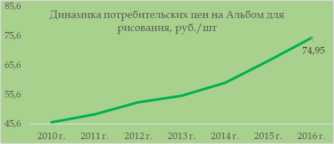 За последние семь лет потребительские цены на Альбом для рисования росли высокими темпами. Причем индекс цен розничной торговли на данный товар в 2015 и 2016 гг. оказался наиболее высоким, составив 12%. Напомним, что, начиная с 2005 года Альбом для рисования дорожал ежегодно в среднем по России на 6%-8%. В 2014 году рост потребительских цен составил 8%.
