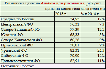 Альбомы для рисования входят в ассортиментный перечень бумажно-беловой продукции. Сегодня на розничном рынке существует многообразие Альбомов для рисования с разнообразными обложками, количеством листов и соответственно широким спектром цен. В соответствии с результатами ценового мониторинга Росстата розничной торговли российского рынка, средние потребительские цены, включая НДС, на Альбом для рисования в декабре 2016 года в целом по России установились на уровне 74,95 руб. за шт., что на 11,8% больше, чем год назад. Напомним, что в 2015 году цены на альбомы выросли на 12%.