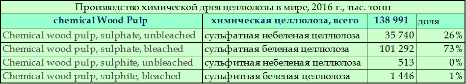 Химическая целлюлоза по методу варки в значительной степени представлена сульфатной беленой целлюлозой, удельный вес - 73%. Свыше 26% химической целлюлозы в мире составляет сульфатная небеленая целлюлоза. На долю сульфитной беленой целлюлозы приходится всего 1%. Сульфитной небеленой целлюлозы в мире производится еще меньше - не более 0,4% от объема выпуска древесной массы.