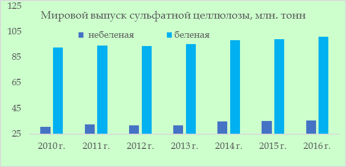 Производство целлюлозы в мировом масштабе последние пять лет ежегодно увеличивается на 1%-2%. В результате глобальный выпуск целлюлозы за рассматриваемый период вырос более чем на 7%. Максимальный рост выпуска был зафиксирован в 2014 году – рост составил 4%. В 2015 году и в 2016 году мировое производство целлюлозы выросло еще на 1% и 2% соответственно.
