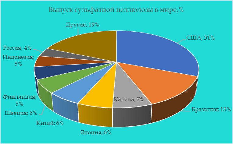 Россия занимает девятую строчку в мире по уровню выпуска сульфатной целлюлозы. В 2016 году было выпущено 5 122 тыс. тонн сульфатной целлюлозы, рост 5%. Россия, в отличии от всех предыдущих стран, в наибольшей степени производит небеленую сульфатную целлюлозу. Так на долю выпуска более дешевой целлюлозы приходится около 70% всего выпуска целлюлозы. Экспорт составил 52%.