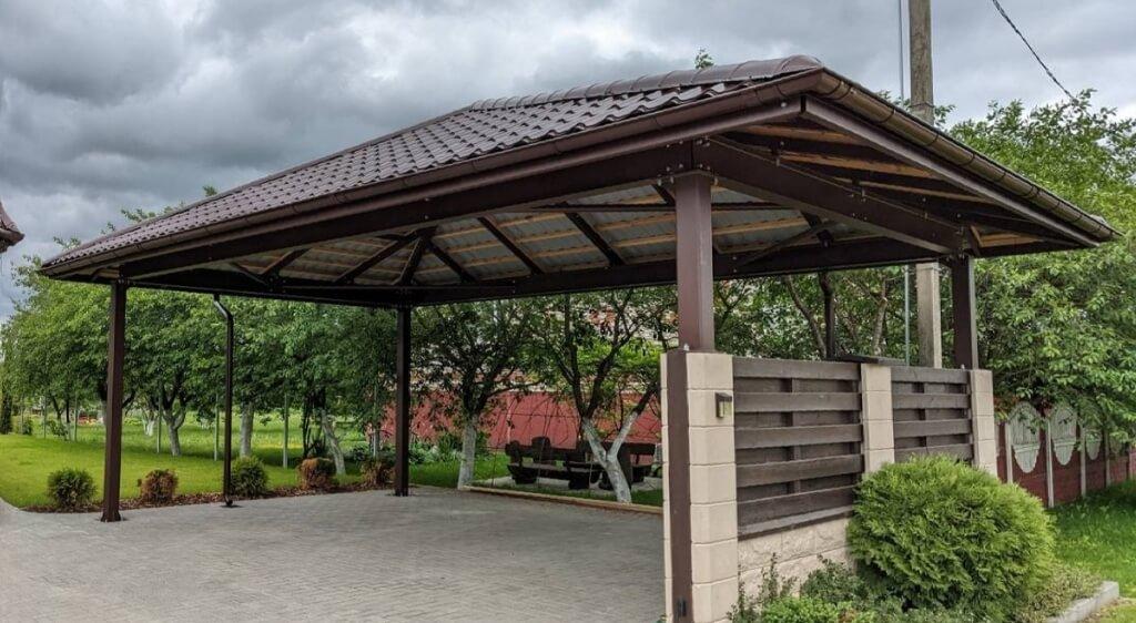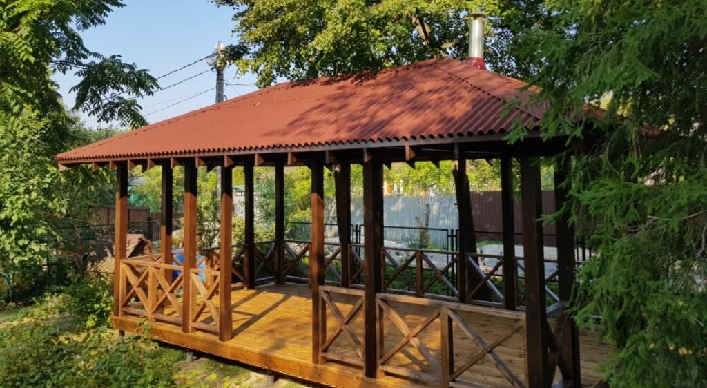 Недостаток здесь тот же — шум во время дождя. Кроме того, слишком тонкие листы легко повредить, а от жары металл сильно нагревается, превращая беседку в своеобразную теплицу. Поэтому рациональнее использовать профлист, если постройка стоит в тени.