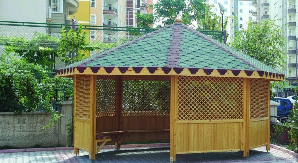 Если беседка имеет круглую крышу или замысловатую форму, удобнее всего использовать мягкую битумную черепицу. Она выпускается в виде небольших модулей разной формы — от ромбов до шестиугольников. Цветов тоже масса, так что дизайн можно сделать индивидуальным.