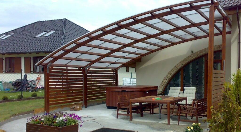 Это прозрачные или полупрозрачные листы разного цвета, которые пропускают свет и защищают от дождя. Из него можно сделать не только крышу, но и стены беседки. Плюсы: легкость, долговечность, устойчивость к влаге и эстетичный вид. Но при сильном солнце беседка превращается в парник, а от механических ударов материал может пострадать.